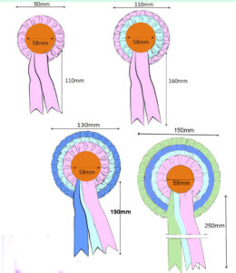 The rosettes have a 57mm centre and are available with 1, 2, 3 or 4 tiers of pleated ribbon (Elizabethan pleat).